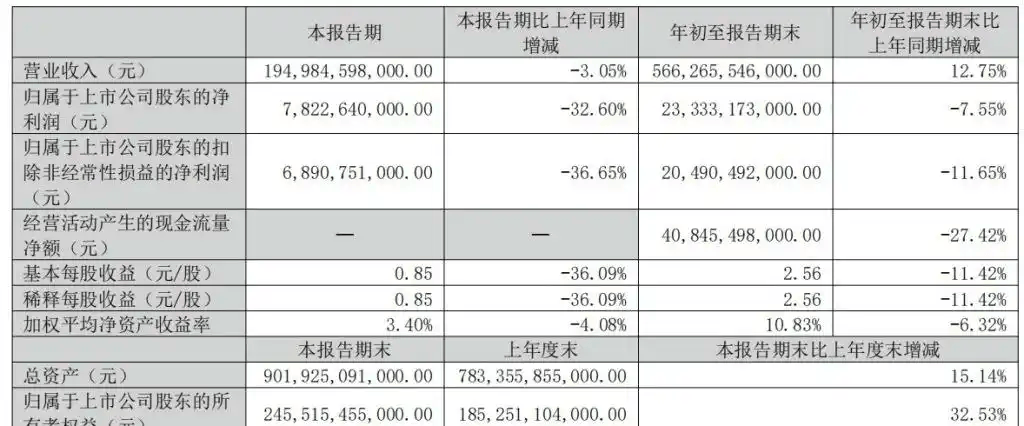 比亚迪第三季度实现营收1949.8亿元,同比下降3.05%,这是公司自2020年以来单季度营收首次出现下降;前三季度营收达5662.65亿,同比增长12.75%。此外,比亚迪前三季度实现净利润233.33亿元,同比下降7.55%;第三季度实现净利润78.23亿元,同比下降 32.6%。