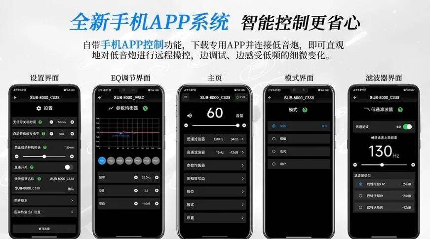 相较于同类产品,风暴8000的核心优势在于功能强大的配套APP,可轻松实现DSP高截/低通调节、0°-180°相位切换、7段专业参量EQ调节及直通开关等操作。