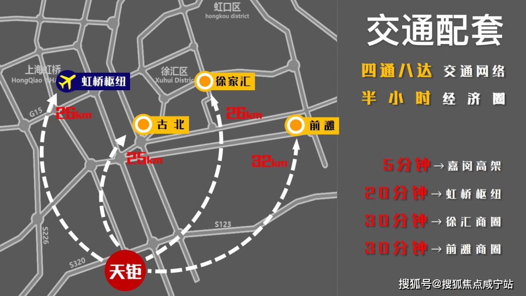 申嘉湖高速(直通浦东国际机场),虹梅南路高架(连接市中心)、沪金高速、沪闵路、嘉闵高架(直达虹桥交通枢纽)。