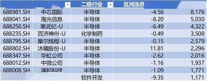上图是本周科创板前十大权重公司呈现大部分下跌,沐曦股份-U是权重中少数正收益品种,金山办公跌幅较大。