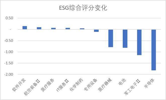 上图是本周ESG评分变化行业分布,本文统计了排名最高和最低的5个行业,本周ESG评分变化排名变化最大的细分行业:软件开发、航空装备、医疗服务。