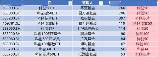 上表是按照最新规模统计,最大的10只科创板相关公募基金,各自有跟踪指数。规模较大的科创板ETF大致可分为三类:科创50、科创100、双创50。