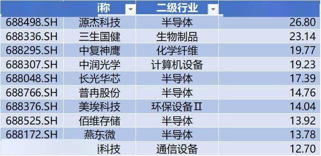 上表是本周涨幅榜前十公司,排名前十的公司分别是:源杰科技、三生国健、中复神鹰、中润光学、长光华芯、普冉股份、美埃科技、佰维存储、燕东微、鼎通科技。