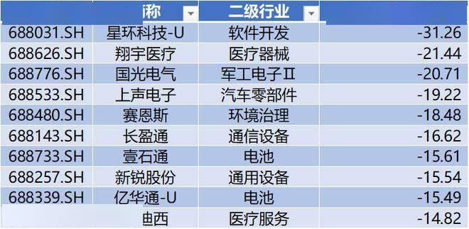 上表是本周跌幅榜前十公司,分别为:星环科技-U、翔宇医疗、国光电气、上声电子、赛恩斯、长盈通、壹石通、新锐股份、亿华通-U、美迪西。