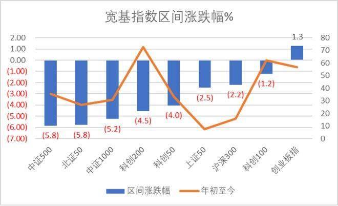 如上图,本周A股主要宽基指数呈现分化,创业板指成为少数正收益部分,中证500居末。其中,科创100、科创50、科创200分别跌:1.2%、4.0%、4.5%。