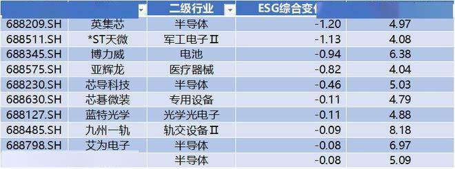 上表是ESG评分变化下降的前十家公司,分别为:英集芯、*ST天微、博力威、亚辉龙、芯导科技、芯碁微装、蓝特光学、九州一轨、艾为电子、必易微。