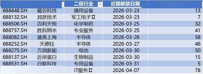 经过wind数据终端查询,近期有解禁的公司,本文剔除金额小于5亿的部分,然后按照时间顺序由近至远,选取前10家公司,分别为:磁谷科技、邦彦技术、百利天恒、胜科纳米、盛美上海、天德钰、万润新能、近岸蛋白、日联科技、云天励飞-U。