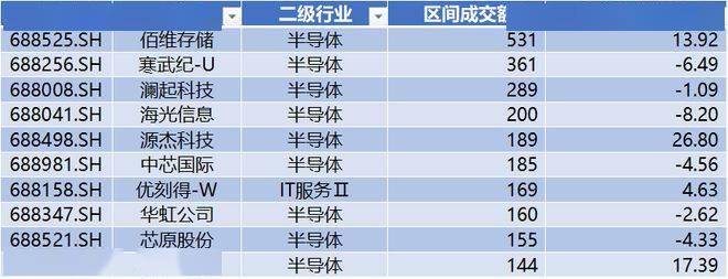 上表是本周成交额(亿)前十公司,分别为:佰维存储、寒武纪-U、澜起科技、海光信息、源杰科技、中芯国际、优刻得-W、华虹公司、芯原股份、长光华芯。
