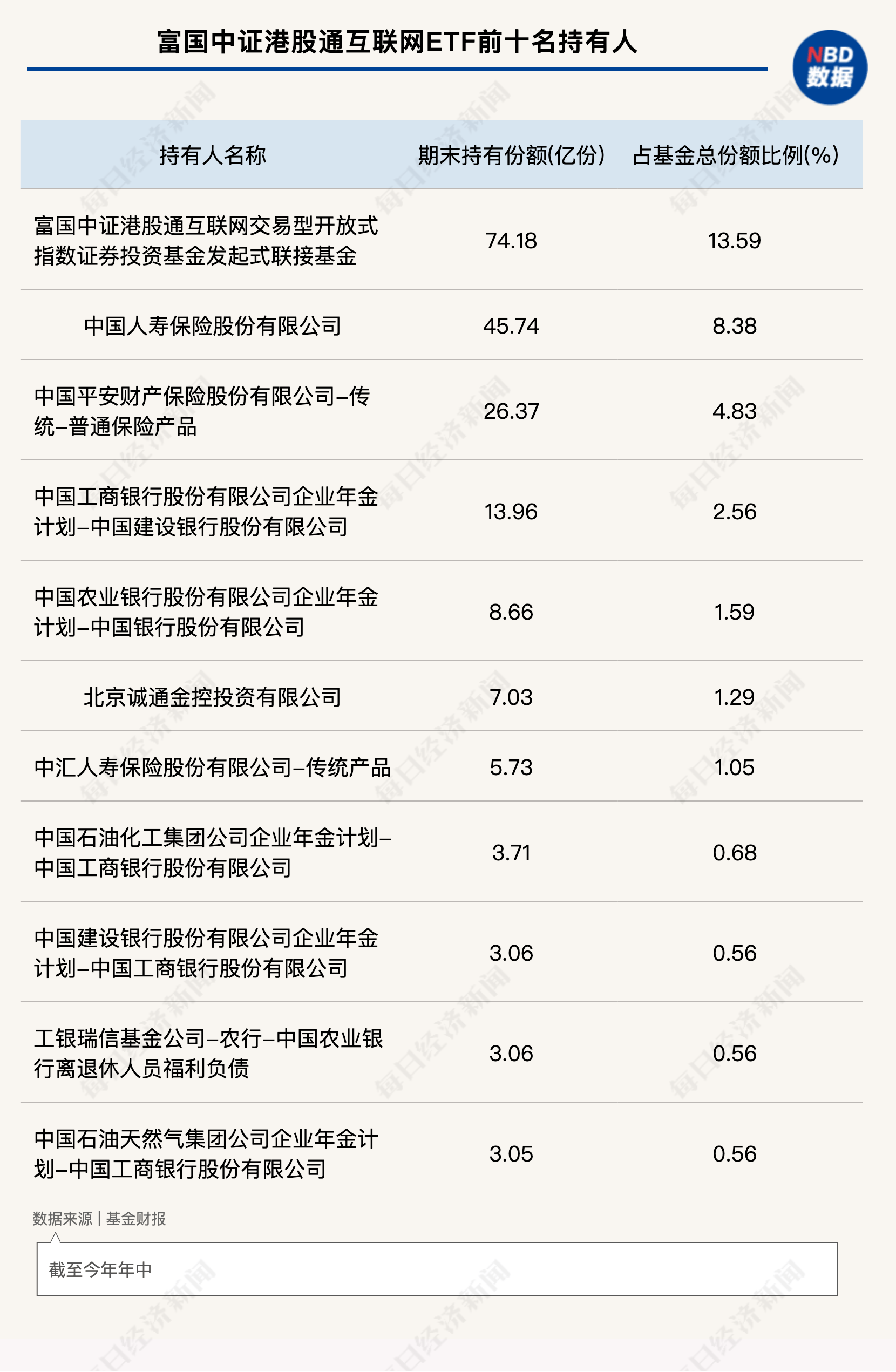 根据Wind数据,截至今年年中,富国中证港股通互联网ETF的持有人户数为38460户,相比去年年底增加了110.72%。其中,机构投资者持有总份额占比为96.57%,个人投资者占比3.43%,也从侧面反映出机构投资者对该产品的偏好。