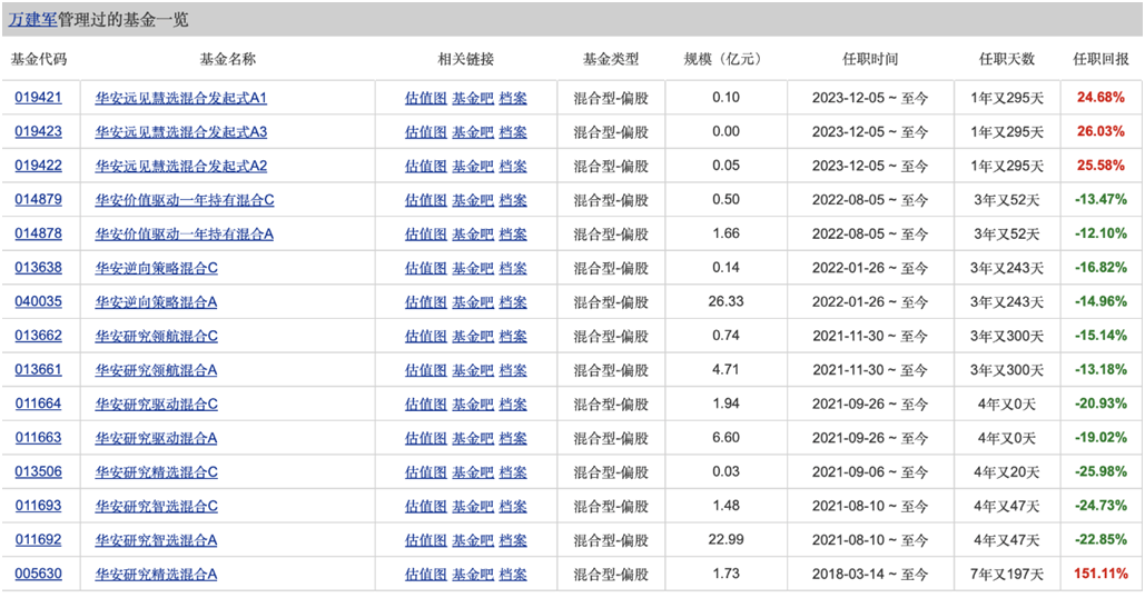 基金经理“一拖多”的情况进一步加剧了困境。联席首席权益投资官万建军同时管理15只偏股混合基金,总规模约69亿元,但其管理的华安研究精选混合C累计回报为-25.98%,华安研究智选混合C回报为-24.73%,均长期落后基准。