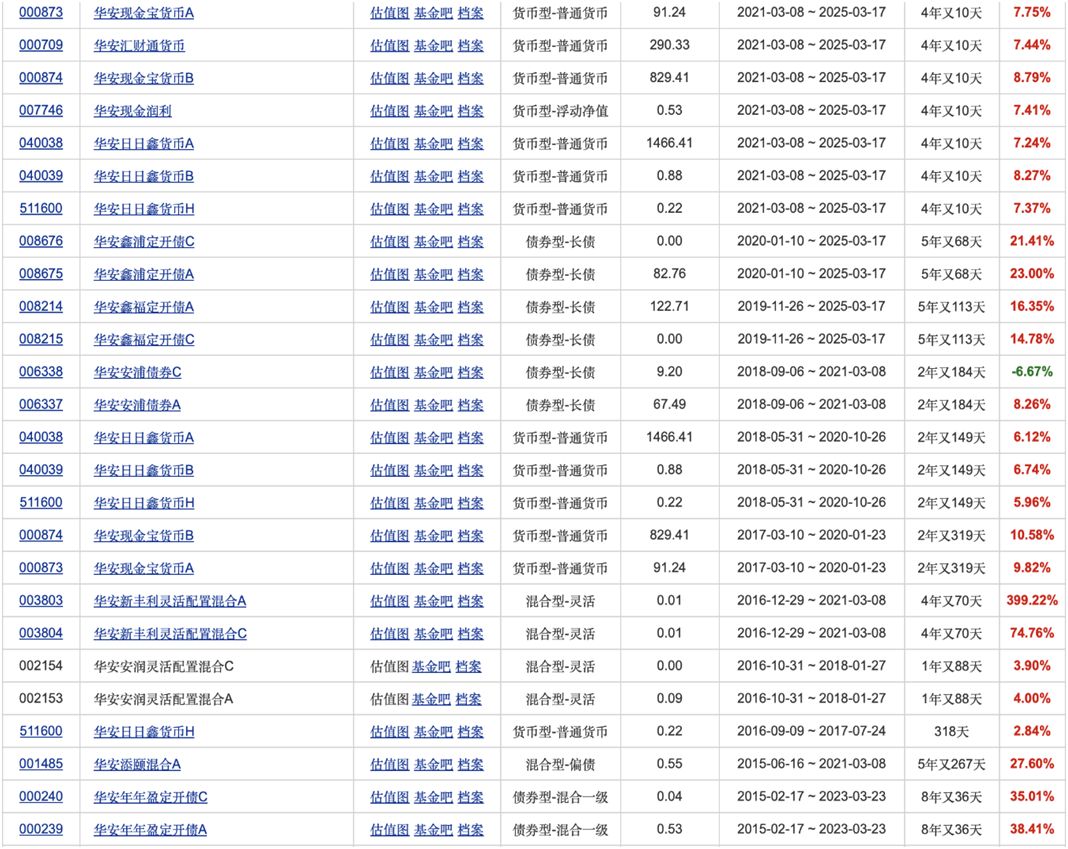 从具体基金经理来看,业绩表现同样欠佳。王春自2022年起管理的华安品质领先混合A任职回报为-34.08%,远低于基准;华安品质领先混合C与华安新能源主题混合C任职回报分别为-35.32%和-24.24%。即便是任职近十年的华安宏利混合A,累计回报也仅52.49%,缺乏长期竞争力。
