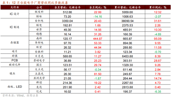 IC设计领域联发科12月份营收当月同比增幅扩大19.34个百分点至22.99%,联咏营收当月同比降幅扩大6.93个百分点至-14.16%。IC制造领域,12月份台积电营收当月同比增幅收窄4.04个百分点至20.43%;联电营收当月同比增幅收窄4.25个百分点至1.66%;世界营收同比增幅扩大5.93个百分点至14.56%;稳懋营收当月同比增幅扩大1.66个百分点至31.26%。存储器厂商南科营收同比增幅扩大79.98个百分点至444.87%,华邦电同比增幅扩大14.63个百分点至53.33%,旺宏营收同比增幅扩大20.32个百分点至44.94%。硅片台胜科当月同比增幅扩大2.05个百分点至3.82%;封装日月光当月同比增幅扩大0.15个百分点至11.27%;PCB厂商景硕电子营收同比增幅收窄14.47个百分点至25.23%;被动元件厂商国巨营收当月同比增幅扩大7.34个百分点至29.74%,镜头厂商大立光营收同比降幅收窄11.50个百分点至-0.34%,玉晶光当月营收同比增幅扩大69.86个百分点至81.50%,亚洲光学营收同比由正转负至-1.87%(前值为19.26%);面板、LED厂商中,群创营收同比转正至19.22%(前值为-8.95%),友达营收同比增幅收窄0.93个百分点至2.42%,亿光营收同比由负转正至0.41%(前值为-3.94%)。