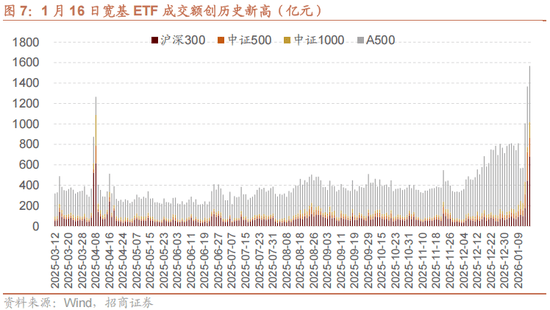 后半周宽基ETF成交额大幅放量。从1月14日周三开始,宽基ETF成交量逐渐放大,至1月16日宽基ETF成交量创下历史新高,超过2025年4月8日重要机构投资者救市时的成交额。详细来看,沪深300ETF成交额达历史新高682亿,中证500、中证1000与中证A500 ETF分别成交182亿、152亿与550亿,远高于历史平均。