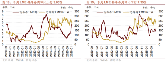 库存涨跌分化,铜、锡、镍库存上行,锌、铝、铅库存下行。截至1月16日,LME铜库存143575吨,周环比上行3.31%;LME铝库存488000吨,周环比下行1.97%;LME锌库存106525吨,周环比下行0.86%;LME锡库存5935吨,周环比上行9.60%;LME镍库存285732吨,周环比上行0.33%;LME铅库存206350吨,周环比下行7.35%。