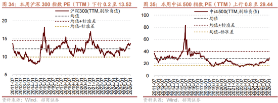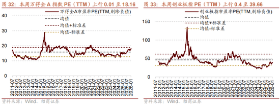 本周整体A股估值水平上行。截至1月16日收盘,万得全A指数PE(TTM)为18.16,处于历史估值水平(10年以来)的75.0%分位数。创业板指PE(TTM)上行0.4至39.66,处于历史估值水平的39.7%分位数。代表大盘股的沪深300指数PE(TTM)下行0.2至13.52,处于77.5%分位数。代表中小盘股的中证500指数PE(TTM)上行0.8至29.44,处于历史估值水平的62.4%分位数