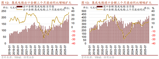 12月集成电路出口、进口金额同比增幅扩大,三个月滚动同比增幅扩大,当月贸易逆差扩大。12月集成电路出口金额为218.63亿美元,当月同比增幅扩大13.56个百分点至47.72%,累计同比增幅扩大2.1个百分点至26.80%,三个月滚动同比增幅扩大5.00个百分点至36.27%;12月集成电路进口金额为426.12亿美元,当月同比增幅扩大2.69个百分点至16.58%,累计同比增幅扩大0.6个百分点至10.10%,三个月滚动同比增幅扩大0.83个百分点至13.57%。当月贸易逆差环比扩大3.17%至207.49亿美元。