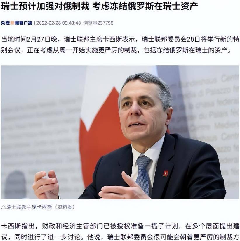瑞士联邦委员会在经过一番内部讨论之后,做出了一个让很多人意想不到的选择:跟着欧盟走,冻结俄罗斯政府、企业和相关个人存放在瑞士的资产。