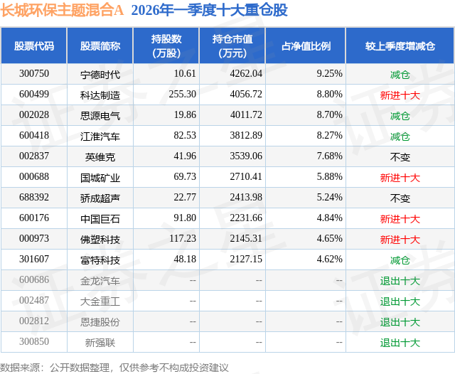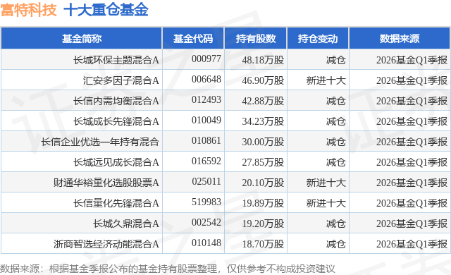 根据2026基金Q1季报公募基金重仓股数据,重仓该股的公募基金共18家,其中持有数量最多的公募基金为长城基金的长城环保主题混合A。长城环保主题混合A目前规模为5.09亿元,最新净值2.9767(4月21日),较上一交易日下跌0.28%,近一年上涨60.43%。该公募基金现任基金经理为廖瀚博。廖瀚博在任的基金产品包括:长城久鼎混合A,管理时间为2019年7月26日至今,期间收益率为197.61%;长城成长先锋混合A,管理时间为2020年9月9日至今,期间收益率为17.21%;长城远见成长混合A,管理时间为2022年9月28日至今,期间收益率为13.13%。