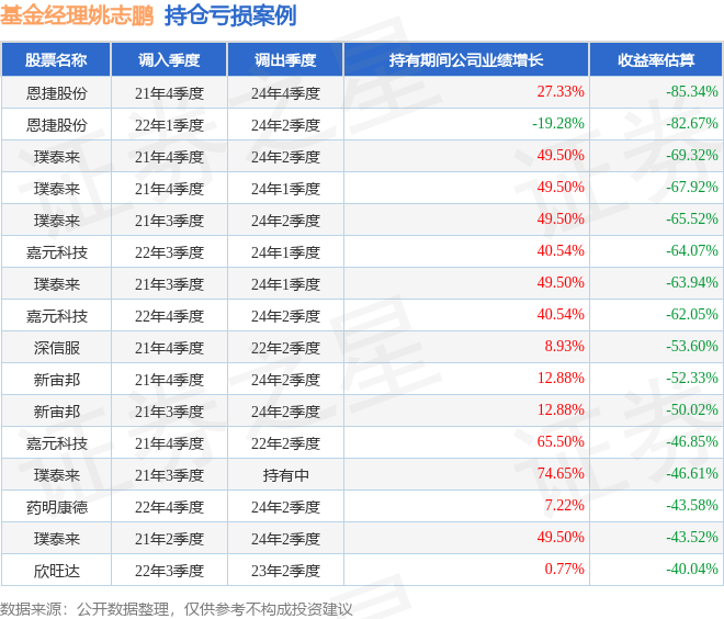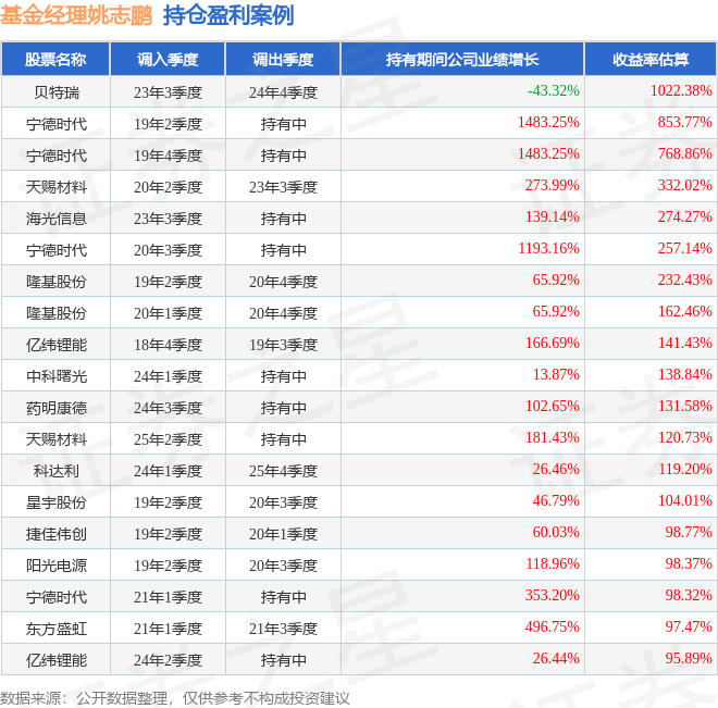 重仓股调仓示例详解: 1、贝特瑞(835185)翻倍案例: 姚志鹏管理的嘉实智能汽车股票基金在23年3季度买入贝特瑞,在持有1年又1个季度后在24年4季度卖出。持有期间的估算收益率为1022.38%,持有期间贝特瑞在2023年到2024年的年报营业总收入降幅为43.32%。 2、捷佳伟创(300724)调仓案例: 姚志鹏管理的嘉实新收益混合基金在19年2季度买入捷佳伟创,在持有3个季度后在20年1季度卖出。持有期间的估算收益率为98.77%,持有期间捷佳伟创在2019年到2020年的年报营业总收入增幅达60.03%。 3、恩捷股份(002812)折戟案例: 姚志鹏管理的嘉实智能汽车股票基金在21年4季度买入恩捷股份,在持有3年又0个季度后在24年4季度卖出。持有期间的估算收益率为-85.34%,持有期间恩捷股份在2021年到2024年的年报营业总收入增幅达27.33%。